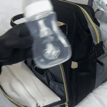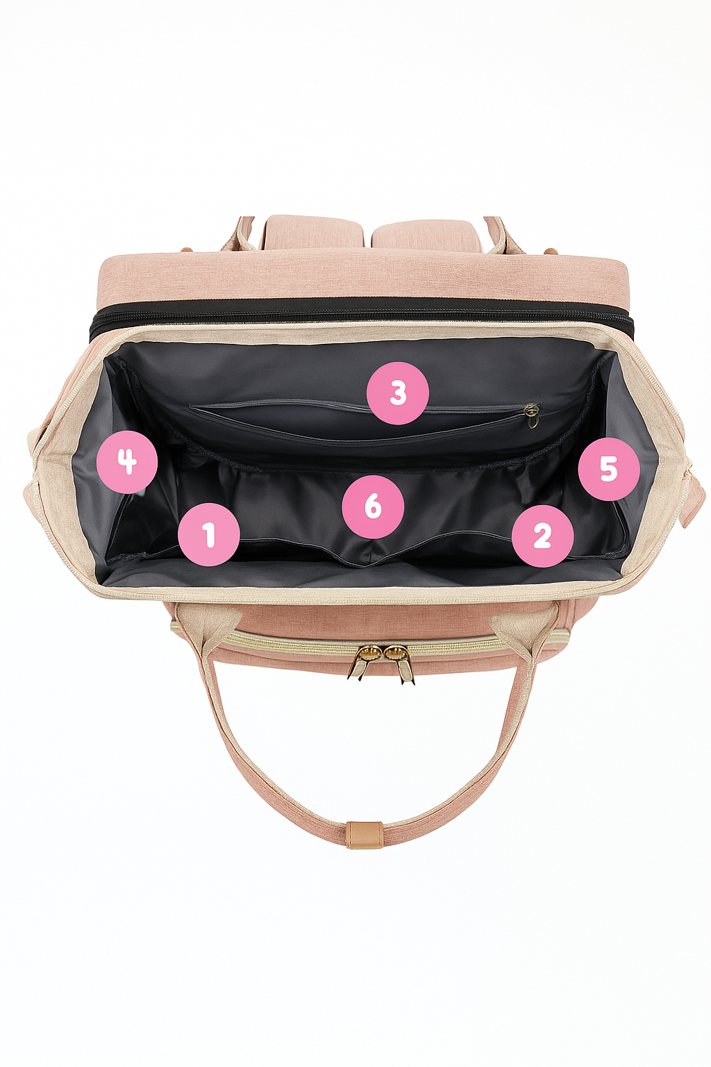 Väskan har flera smarta förvaringsfack, inklusive isolerade flaskhållare, särskilt fack för våtservetter och rymliga sektioner för blöjor, kläder, leksaker och mer. Den är designad för att rymma allt din bebis behöver samtidigt som den är kompakt och lätt att bära.